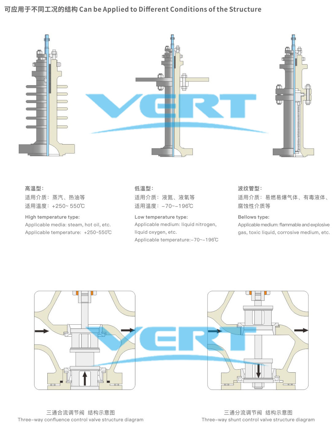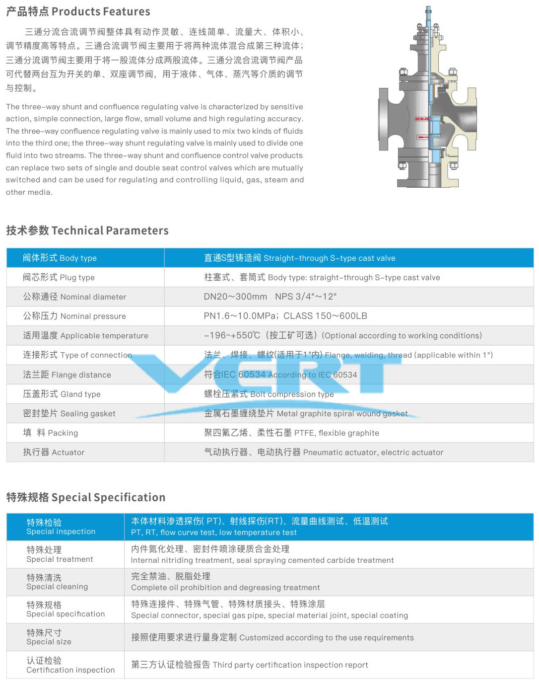 The series of three-way control valves produced by the company have two action modes, three-way confluence and three-ways hunt, which can replace two two-way valves and a three-way valve connection in some occasions and are widely used.To realize the adjustment of pressure, flow, temperature, liquid level and other parameters, the valve core is subject to cylinder thin-wall window, and the side guide of valve core, which has the characteristics of good stability, dif h culty in producing vibration, lownoise, large allowable pressure difference, simple connection, etc.